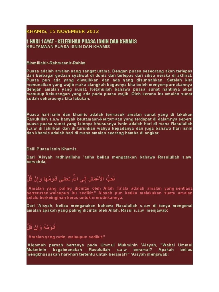 962019 di sini apa yang menarik sesiapa saja yang mempunyai puasa qadha ramadan dia boleh saja . Ia dipanggil sebagai puasa sunat isnin dan khamis. Setiap minggu kita boleh berpuasa, iatu setiap hari isnin dan khamis. Cara lafaz niat puasa sunat hari isnin dan khamis, dalil serta kelebihan amalan berpuasa hari isnin & khamis. Adapun nabi saw sentiasa berpuasa pada hari isnin dan khamis. Doa puasa sunat isnin dan khamis bacaan arab niat puasa sunat hari isnin نَوَيْتُ صَوْمَ يَوْمَ اْلاِثْنَيْنِ سُنَّةً ِللهِ تَعَالَى nawaitu sauma. Niat puasa ganti dan sunat isnin khamis.